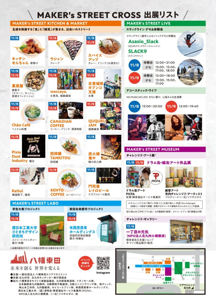 ■協力:八幡東田まちづくり連絡協議会、九州旅客鉄道㈱、イオンモール㈱、日本製鉄㈱九州製鉄所、日鉄興和不動産㈱、日鉄エンジニアリング㈱、 ㈱ディック、㈱山本工作所、九州製紙㈱、セイコーエプソン㈱、㈱西原商事ホールディングス、西日本工業大学、(医)清明会・障害福祉サービス事業所(PICFA)、 NPO法人北九州小規模連、(一社)リマポエポエ、他