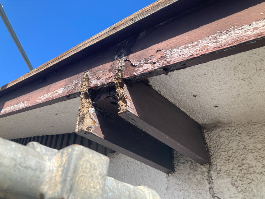 軒先の木部が大きく損傷しており、腐食が進んでいる状態です。