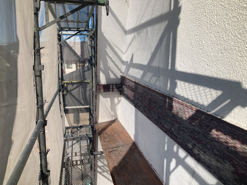 外壁の中段に取り付けられた幕板(まくいた)が大きく傷んでおり、 塗装の剥がれや木部の腐食が進行しています。