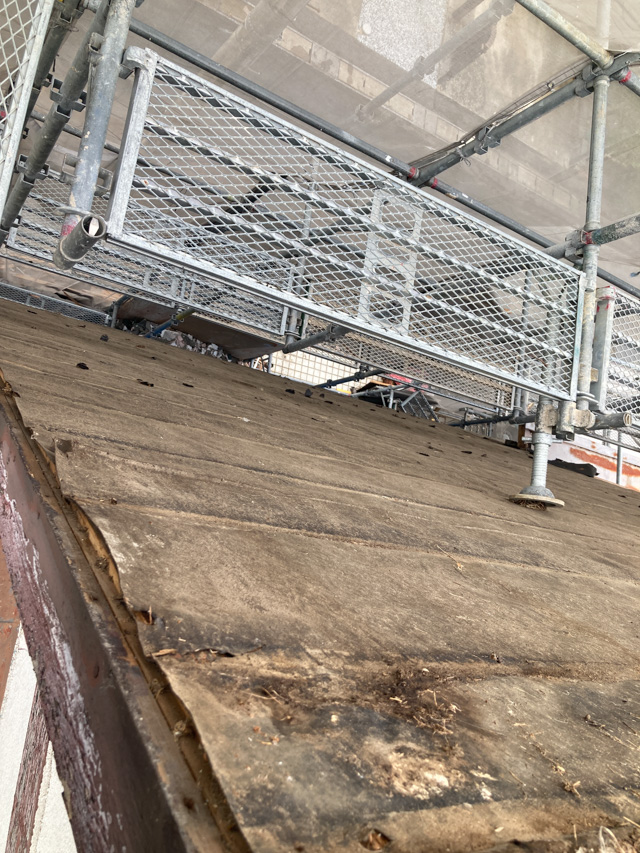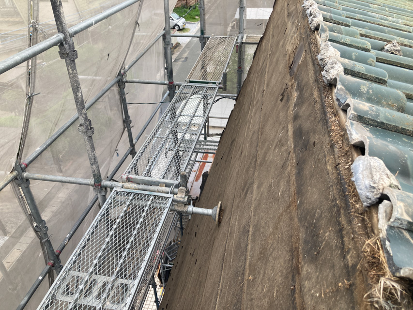 屋根材を撤去し、下地となる防水紙(ルーフィング)が露出した状態です。