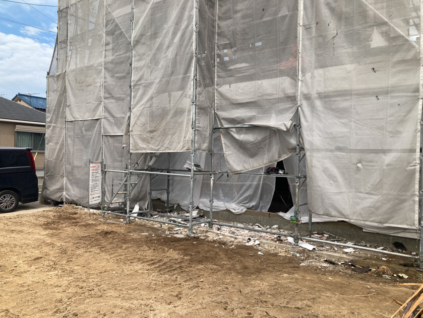 建物の外側は足場とシートでしっかり囲われ、内部の工事が進んでいる様子が外からでもわかります。