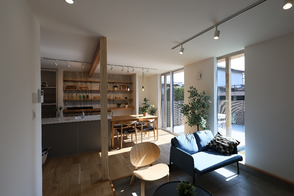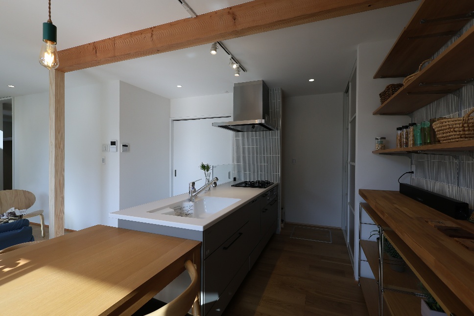 LDKを一体化し、大きな開口と造作棚を取り入れることで、光と風が抜ける開放的な空間へ。