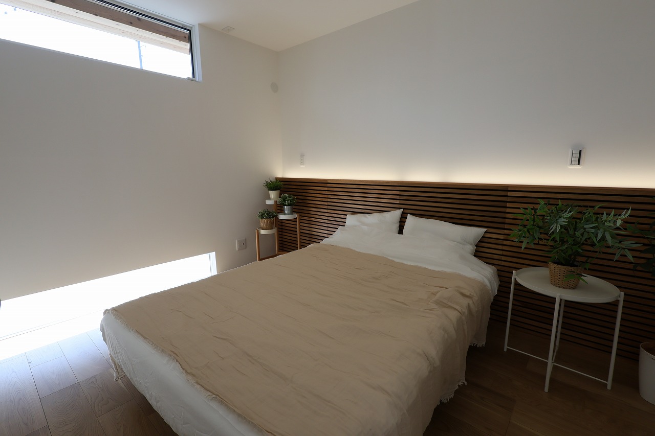 仕上げと採光を見直し、木のヘッドボードが映える落ち着いた寝室へ。