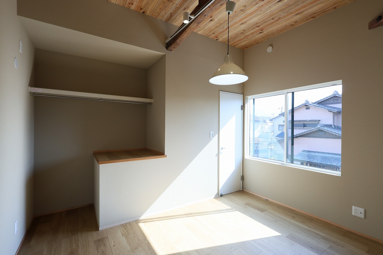 勾配天井の広がりを活かしながら、収納も確保し、シンプルで使いやすい個室へと整えています。