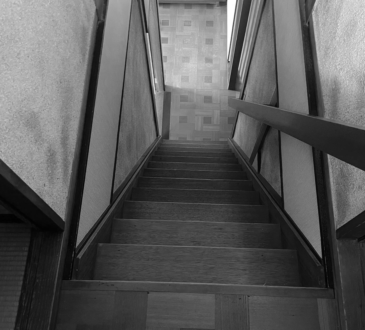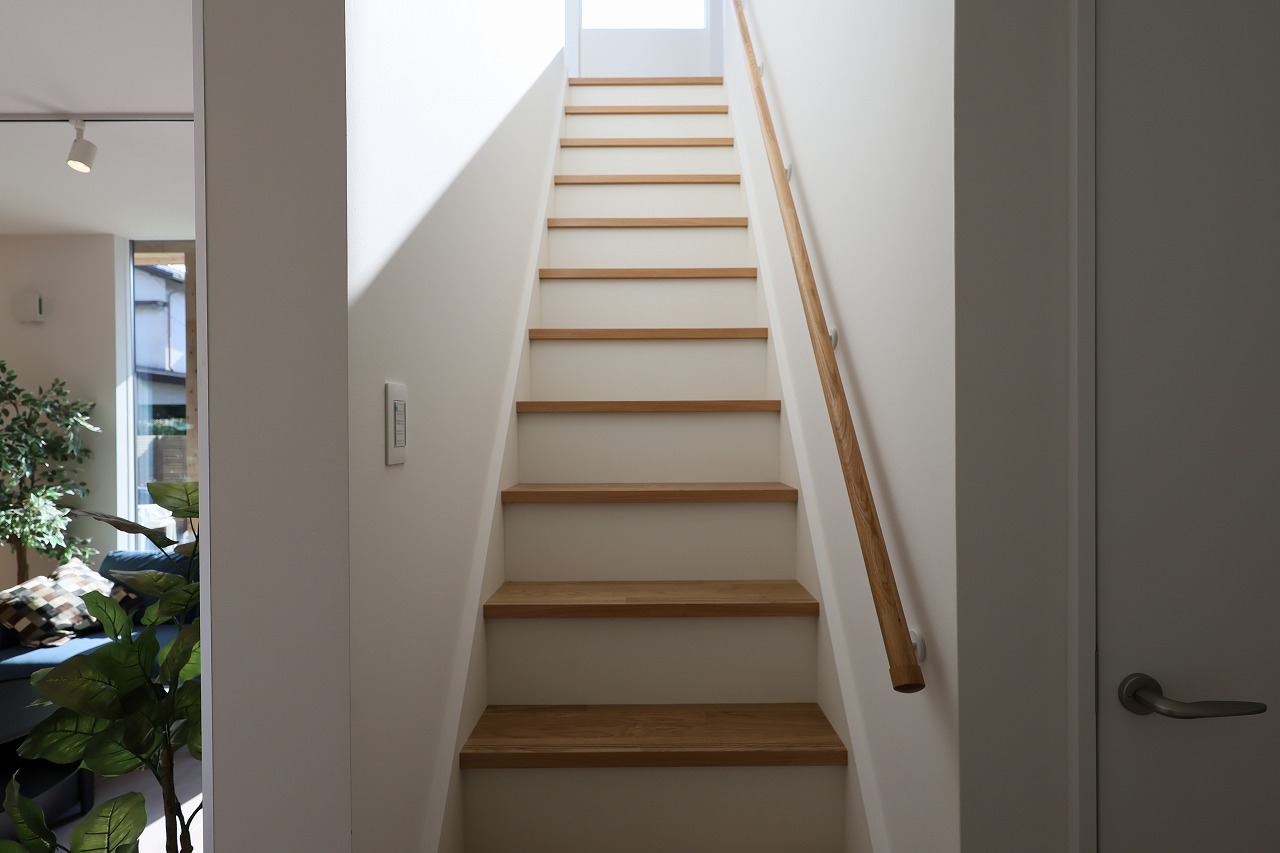 木部や壁の色味が濃く、やや暗い印象だった階段は、明るい壁面と木の踏板・手すりの組み合わせに変更。