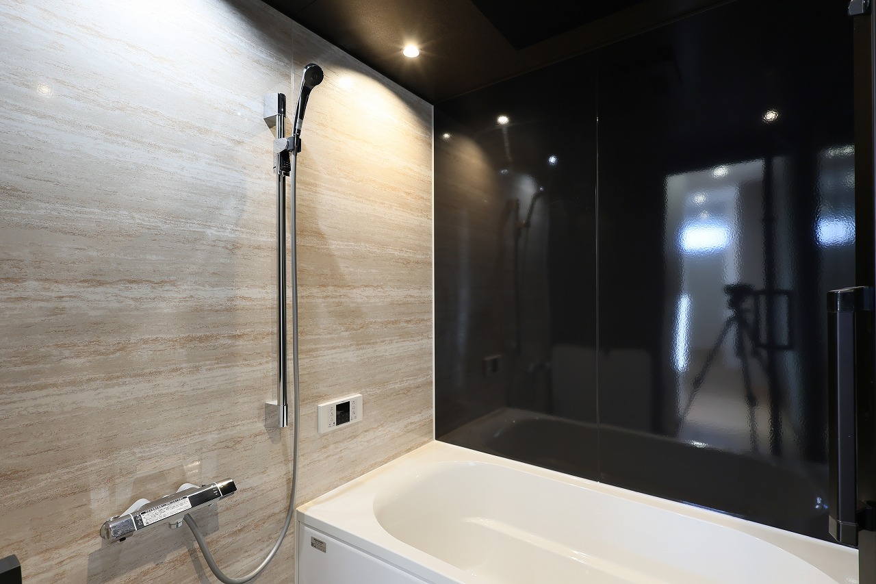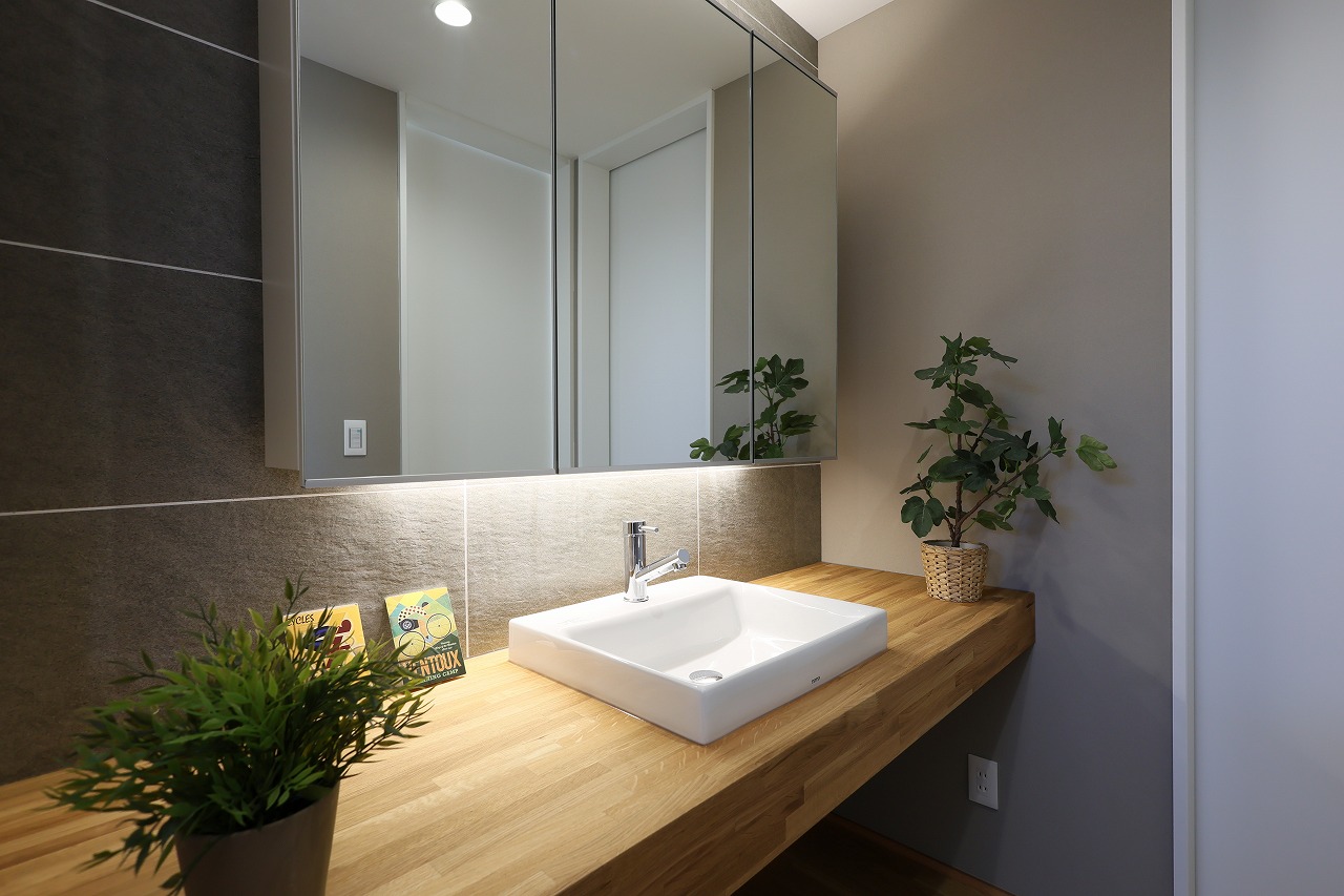 洗面は木のカウンターと大きなミラーでホテルライクに。浴室は落ち着いた配色で上質な空間へ。