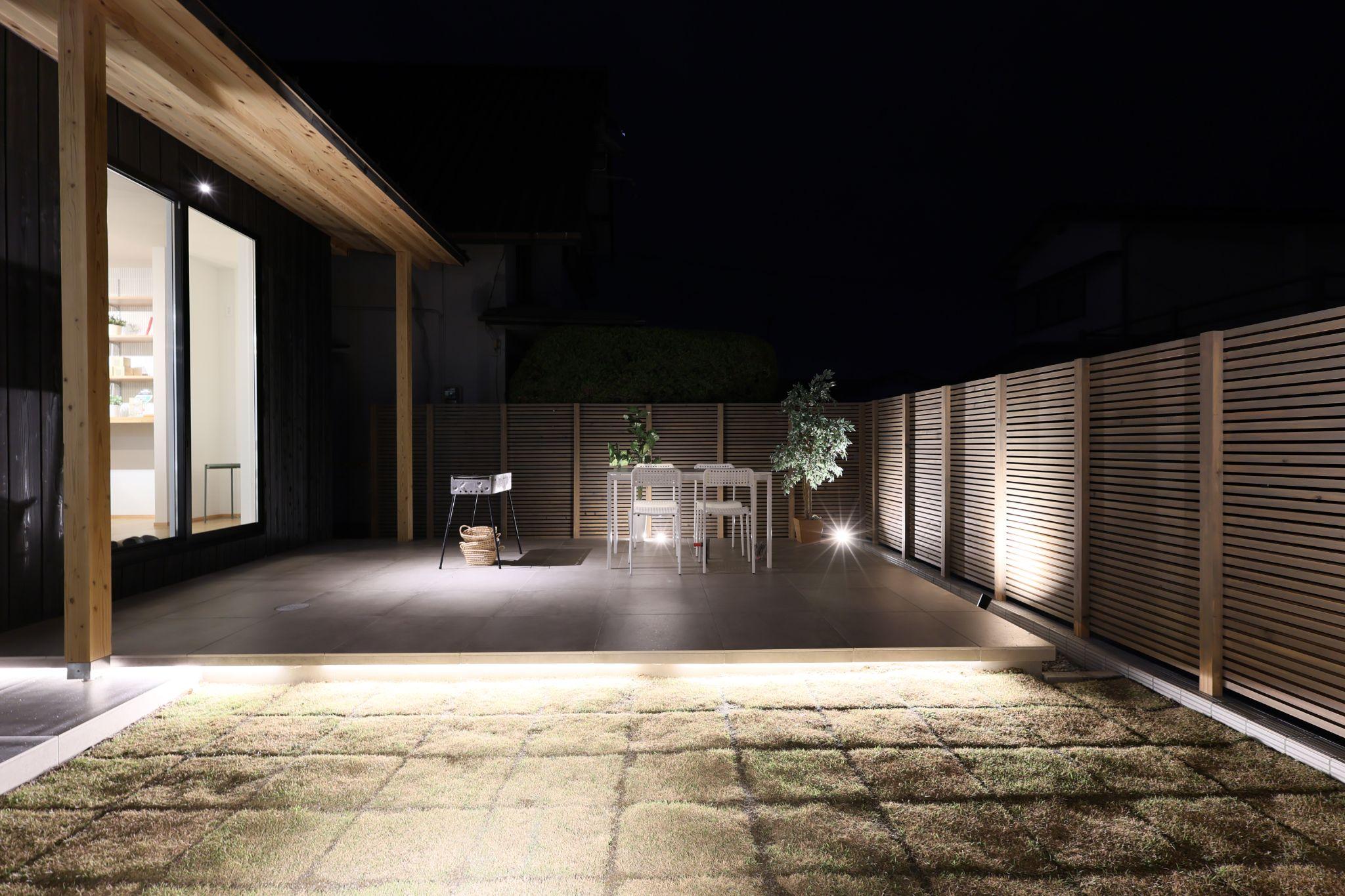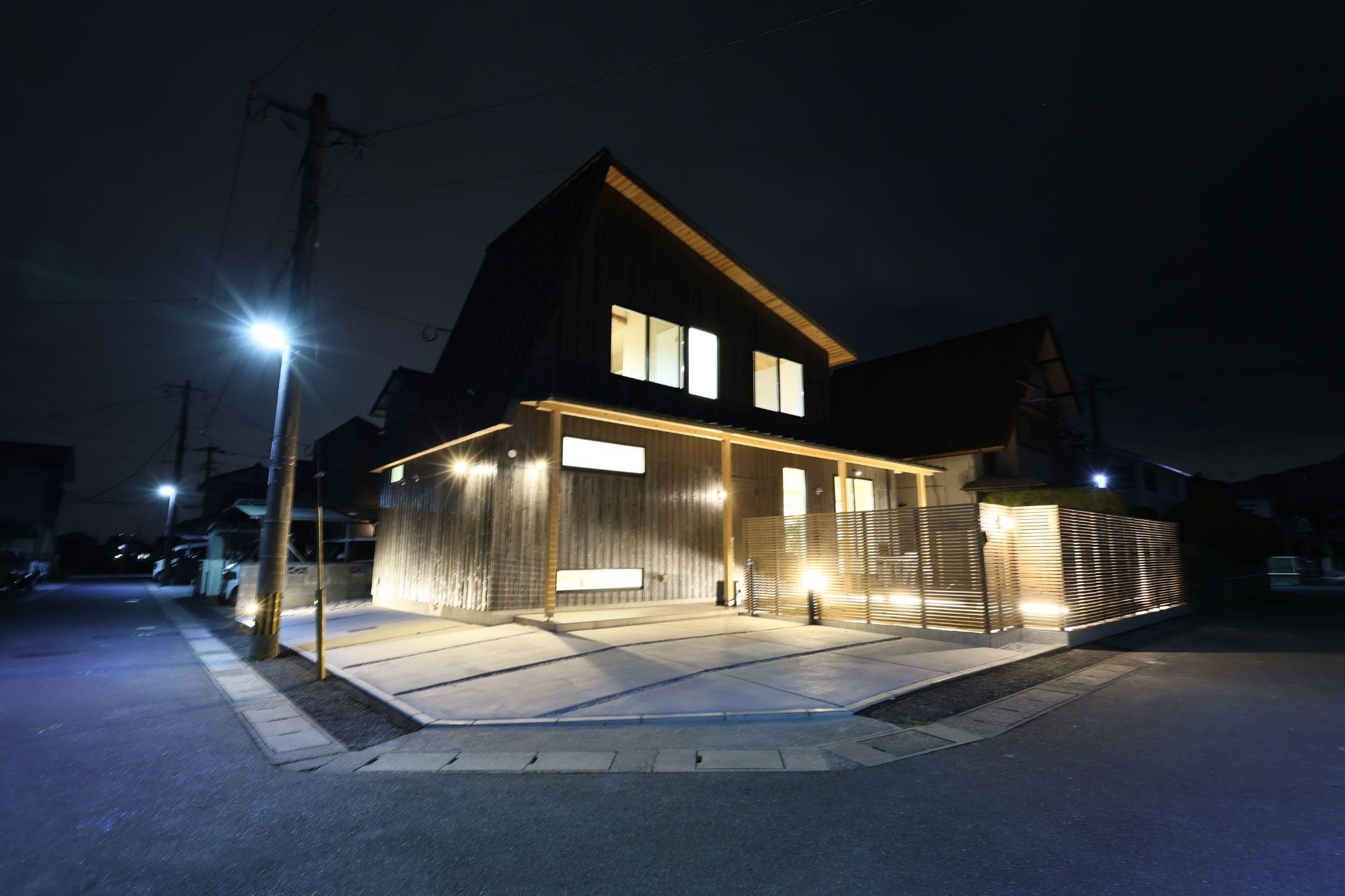 落ち着いた色味の外壁に、軒下や外構の照明を組み合わせることで、夜でも美しく輪郭が際立つ外観に。